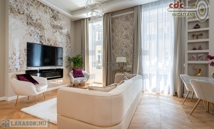 V. kerületben, a Nádor utcában, pár perc sétára a Lánchídtól, 80 m2-es nappali + 2 hálószobás, duplakomfortos, 2. emeleti, erkélyes luxuslakás eladó. Az ingatlan prémium minőségű felújításon esett át, melynek során a legkiválóbb minőségű anyagokat használták fel, a lakás minden részletében az eleganciát tükrözi. Az ingatlan amerikai konyhás nappalival rendelkezik, az erkély illetve a fő hálószoba a csendes Mérleg utcára néz, míg a második hálószoba a nyugodt belső udvarra nyílik. Mindkét hálószobához külön fürdőszoba tartozik, a fő hálószobához egy elegáns káddal, WC-vel és bidével felszerelt fürdő kapcsolódik, míg a második hálószobához egy modern zuhanyzós. A lakásban külön vendég WC is található. Az ingatlan prémium minőségű bútorokkal és gépekkel együtt eladó, így az új tulajdonos azonnal beköltözhet egy teljesen felszerelt, exkluzív otthonba. A teljes körű felújítás során új fa nyílászárók lettek beépítve, valamint minden víz- és villanyvezetékek cserélve lett. Designer csillárok, beépített szekrények, minőségi szaniterek és prémium burkolatok kerültek beépítésre. A 4 méteres belmagasság és a chevron mintás tölgyfa parketta különleges, elegáns hangulatot kölcsönöz az otthonnak. A konyha teljesen gépesített, AEG márkájú készülékekkel felszerelt: mosogatógép, hűtő fagyasztóval, sütő, főzőlap, páraelszívó és mosógép is rendelkezésre áll. Az ingatlan kényelmét három légkondicionáló és automata sötétítők biztosítják. A fűtés házközponti, a közös költség víz nélküli díja 33.104 Ft havonta. A társasház Hild József híres magyar építész egyik remekműve. Az épület az 1800-as években épült, és azóta számos felújításon esett át, megőrizve eredeti szépségét és eleganciáját. Ez a lakás nem csak otthonként, hanem befektetésként is tökéletes választás azok számára, akik a belvárosi luxust és kényelmet keresik. Az ingatlan minden részlete a legmagasabb színvonalat képviseli, így garantáltan megfelel a legigényesebb vásárlók elvárásainak is.