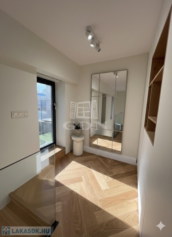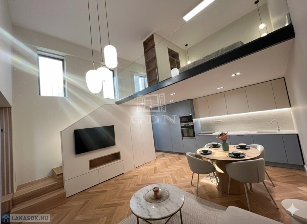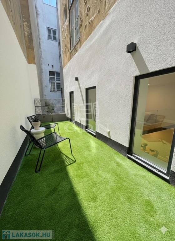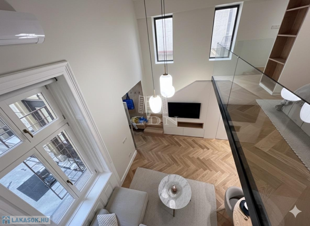 Ez a 104 m²-es, belső két szintes, galériás lakás a 13 m²-es teraszával /eredetileg Lichthof/ egyedülálló lehetőséget kínál a belvárosi élet és a csendes udvari elhelyezkedés kombinációját keresőknek.