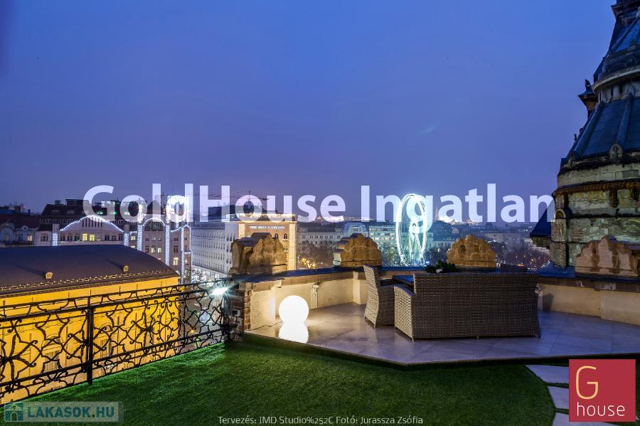 A luxuriour beautifully renovated (2021) and completely furnished 2 bedroom apartment is for long-term rent and for sale in the very heart of Budapest. The spacious and airy apartment consists of a large and sunny living room with dining area, fully equipped kitchen, 1 bedroom resp. study with access to the terrace, 1 bedroom resp. study with cloakroom, 1 bath with bath-tub, shower, and toilet, 1 seperate toilet, 1 large roof terrace (74 m²) with stunning views over the roofs of central Budapest and a room accessible from the terrace with a shower and space for the storage of patio furniture.
