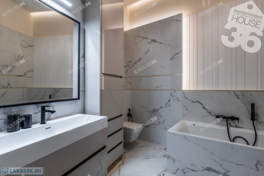 Neves tervezőiroda által megálmodott és egyedileg kivitelezett értékálló polgári lakás. Egyedileg tervezett bútorok, minőségi hidegburkolatok, led fény világítások mellett különleges Onyx kőből épitett bárpult is található.