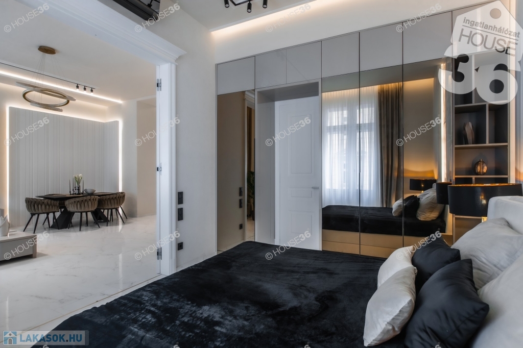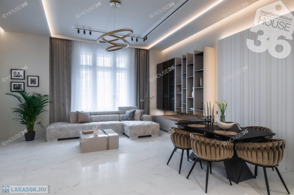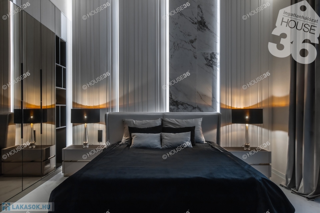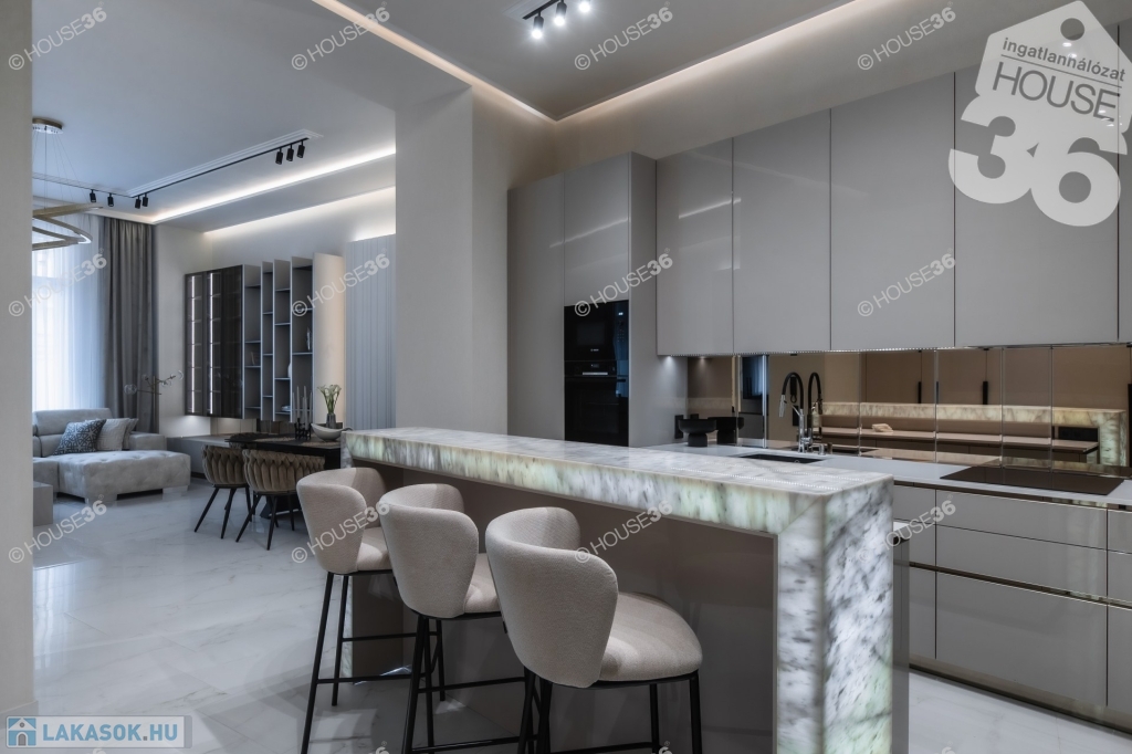 Neves tervezőiroda által megálmodott és egyedileg kivitelezett értékálló polgári lakás. Egyedileg tervezett bútorok, minőségi hidegburkolatok, led fény világítások mellett különleges Onyx kőből épitett bárpult is található.