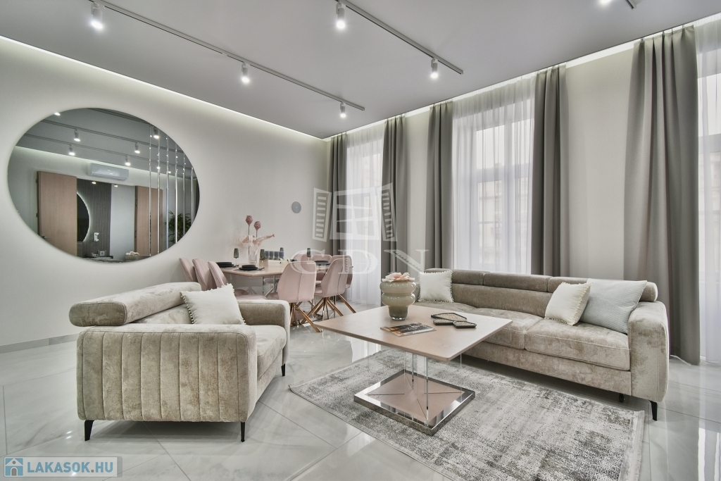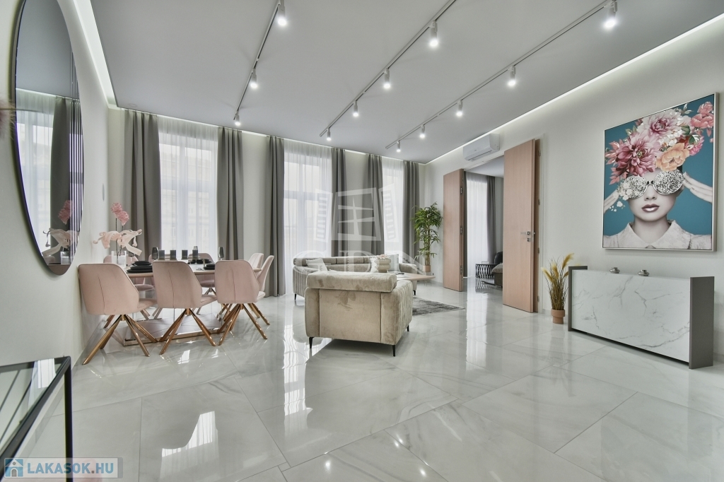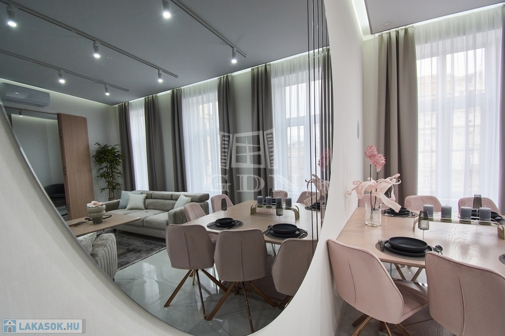 V. kerületben, a Károly körúton -Zsinagógára néző kilátással-, eladásra kínálunk egy 117 m2-es (valóságban 121 m2), 4 szobás (3 háló + amerikai konyhás nappali), dupla komfortos, egyedien és PRÉMIUM minőségben felújított EXKLUZÍV, LUXUS lakást.