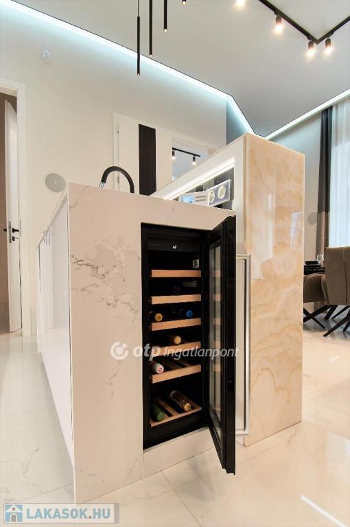 Felszereltség: - 3 rétegű üvegezés a 6 kamrás műanyag nyílászárókon (0,7K), - Motoros alumínium redőnyök, - Padló -és falfűtés Kondenzációs kazánnal, - Hűtő-fűtő klímarendszer Minden szobában, - Gépesített konyha, - Riasztó, Safe, - Ledes fő-és hangulatvilágítás rendszer, - Stand by kapcsoló rendszer, - HD Projektor, motoros vászon (12 nm) , -5.1.-es házimozi rendszer, Beépített Hangfalak, - Szauna, - Masszázs kád, - Teljes falfelület dryvit hálózva a repedések elkerülése érdekében, - Teljes falfelület tapétázva, - Teljes hangszigeteltség Blue Aqusto és Üveggyapottal, - Egyedileg gyártott fa ajtók, bútorok.