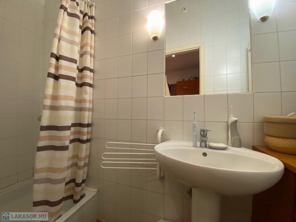 A fürdőszoba zuhanyzós, a meleg vizet gázvízmelegítő szolgáltatja, a WC pedig külön helyiségben van, ablakos.