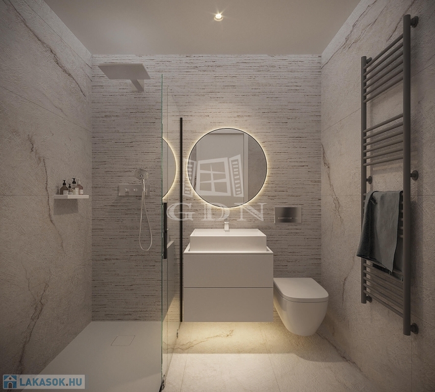 A lakás hőellátását és hűtését teljesen megújuló energiaforrással, a külső levegő hőenergiájának felhasználásával terveztük, amelyet osztott „Split” rendszerű hőszivattyúval hasznosítunk hűtési, fűtési és használati melegvíz termelés célra. A hőszivattyúk elektromos ellátása GEO tarifás áram vételezéssel történik. Ezenkívül a lakás magas színvonalú Smart Home rendszerrel van felszerelve.