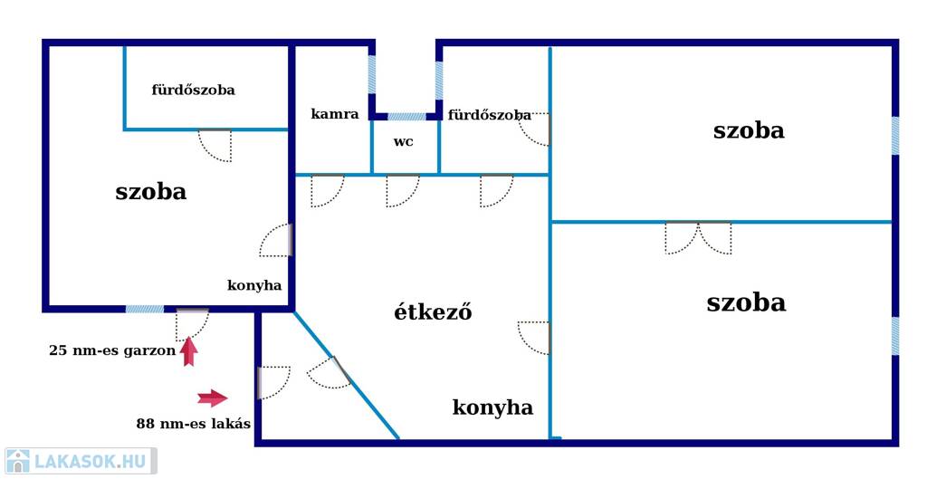 Az ingatlan 113 nm-es amely jelenleg 2 bejárattal rendelkezik, de a két lakás között az átjárás jelenleg is biztosított.
