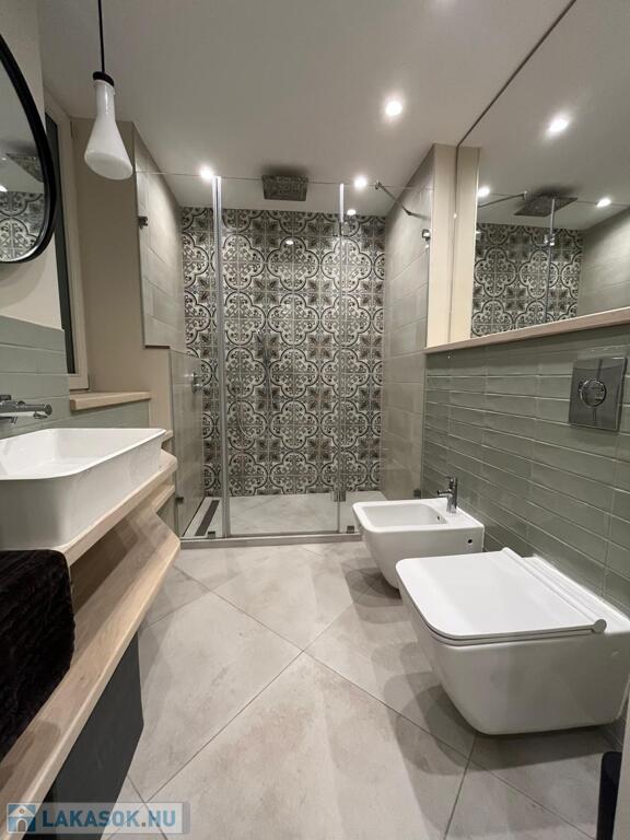modern fürdőszoba zuhanyzóval, WC-vel és bidével