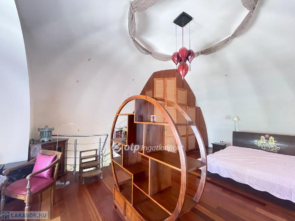 Az elegáns, tömör fából készült lépcső egy rendkívül tágas hálóhelyiséghez vezet az emeleten, mely igény esetén két különálló hálószobává is alakítható. Ezen a szinten található egy nagy méretű, beépített sarokgardrób is, mely praktikus tárolási lehetőséget biztosít.