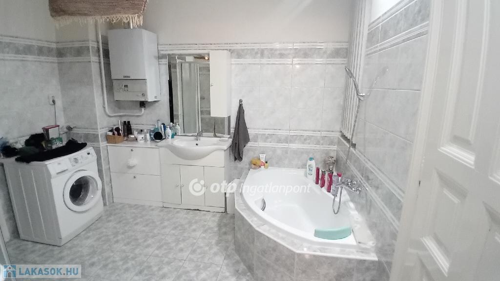 A lakásban három nagy szobából kettő az ucára, egy az udvarra néz. A fürdőszobája is méretes, kád és tusoló is található benne. A WC külön bejáratú. Jól felszerelt konyhája egyben van az étkezővel. A konyhából egy nagy kamra nyílik, amiből még egy kis spejzba jutunk. A fűtést gáz-cirkó kazán biztosítja. Négyméteres belmagassága miatt kiválóan galériázható.