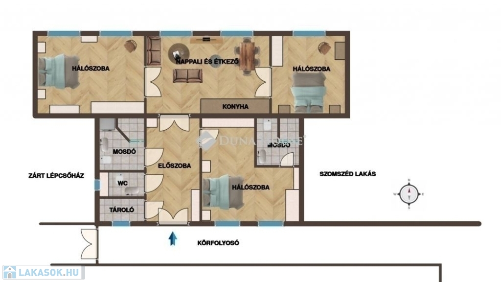 A terek arányai kiválóak: minden helyiség jól használható, könnyen berendezhető, a lakás pedig a remek elrendezésnek köszönhetően akár többgyermekes családnak, akár otthonról dolgozó párnak is ideális. A fürdők igény szerint tovább alakíthatók, akár nagyobb kádas megoldásra is.