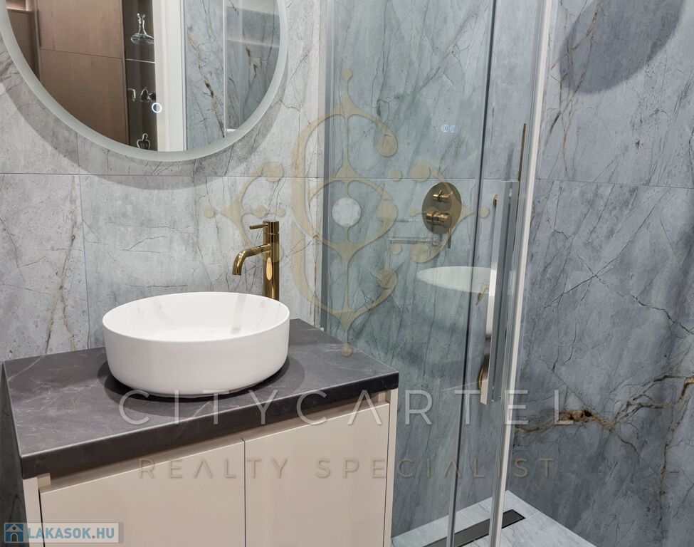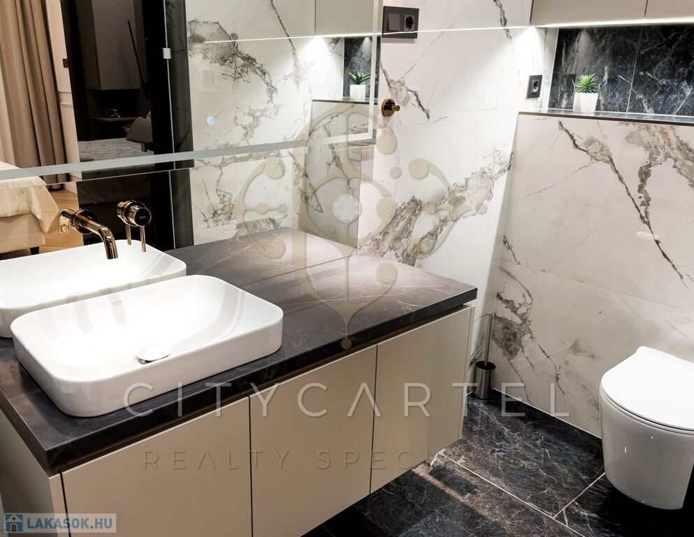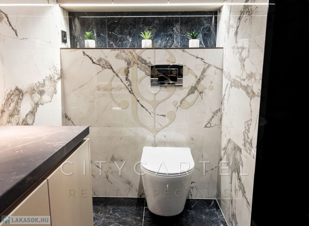 A fő hálószoba saját, kádas fürdőszobával és WC-vel rendelkezik, ezen felül pedig egy második, zuhanyzós fürdőszoba is a lakás része, szintén WC-vel.