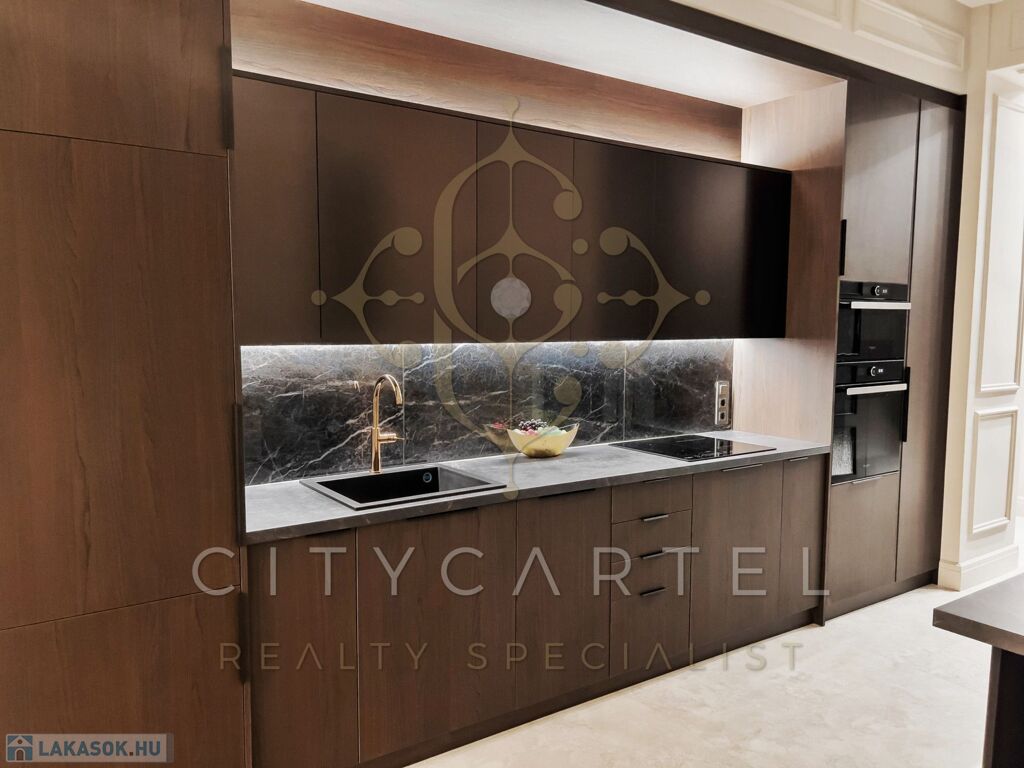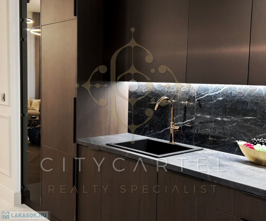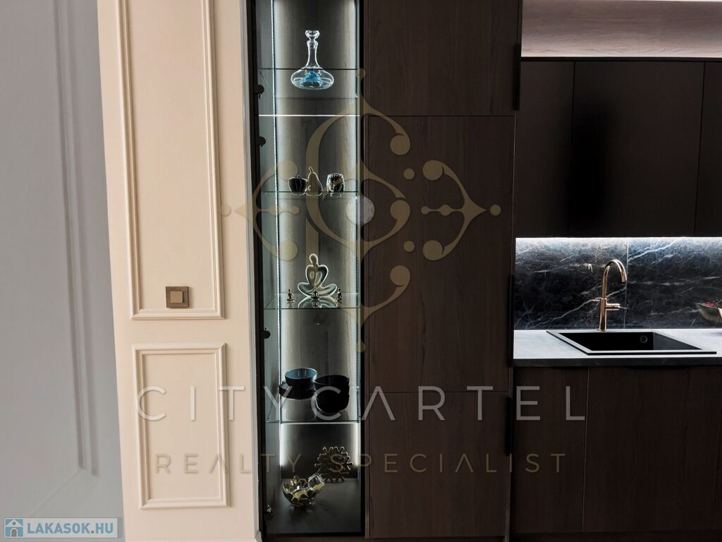 A lakás egyik különlegessége a tágas konyha, ahol konyhasziget kapott helyet, benne beépített borhűtővel, ami igazi kényelmi pluszt nyújt a mindennapokban. Emellett található egy külön kis háztartási helyiség, ahol a mosógép és a szárítógép került elhelyezésre – praktikus, zajtól elszeparált megoldás.