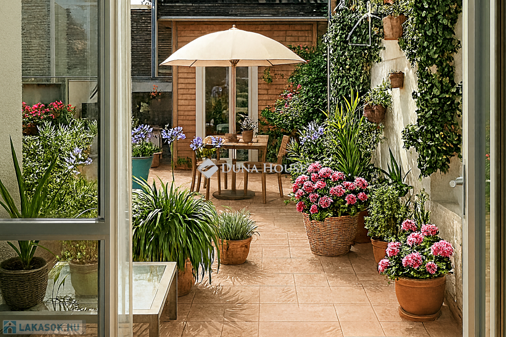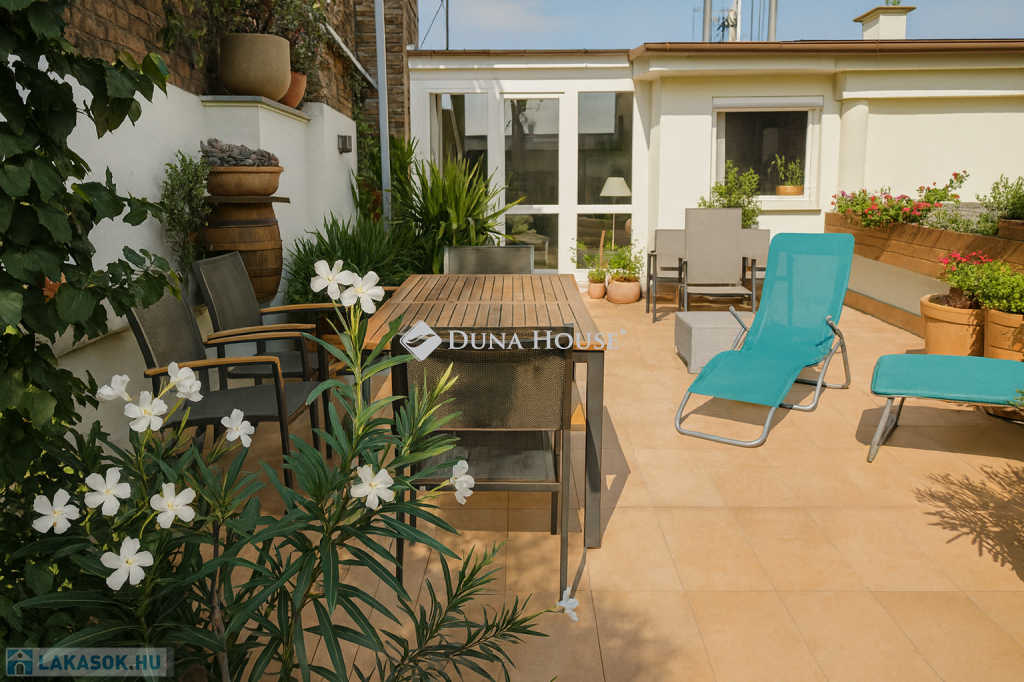 A teraszról páratlan panoráma nyílik a budai hegyekre és a város látképére tökéletes helyszín baráti összejövetelekhez vagy nyugodt pihenéshez.