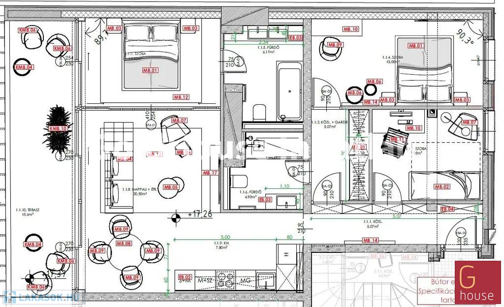 A kínált ingatlan a projekt egyik kiemelt egysége: nettó 85,91 m² alapterületű, 4. emeleti penthouse lakás, amely egy amerikai konyhás nappalit, három külön nyíló hálószobát, két fürdőszobát, valamint egy 13,14 m²-es teraszt foglal magában.