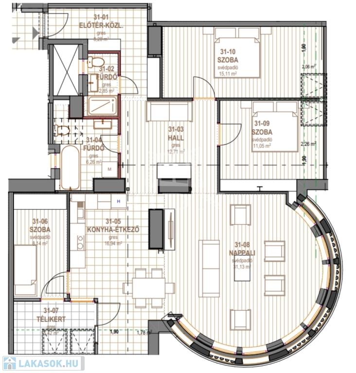 Az enteriőrt személyre szabottan alakítjuk ki, így otthonod megfelel az igényeidnek és kifejezi egyediségedet .Az apartman három hálószobához kétl fürdőszoba tartozik, valamint egy 2,4m2-es loggia is. A pontos beosztás az alaprajzon látható.