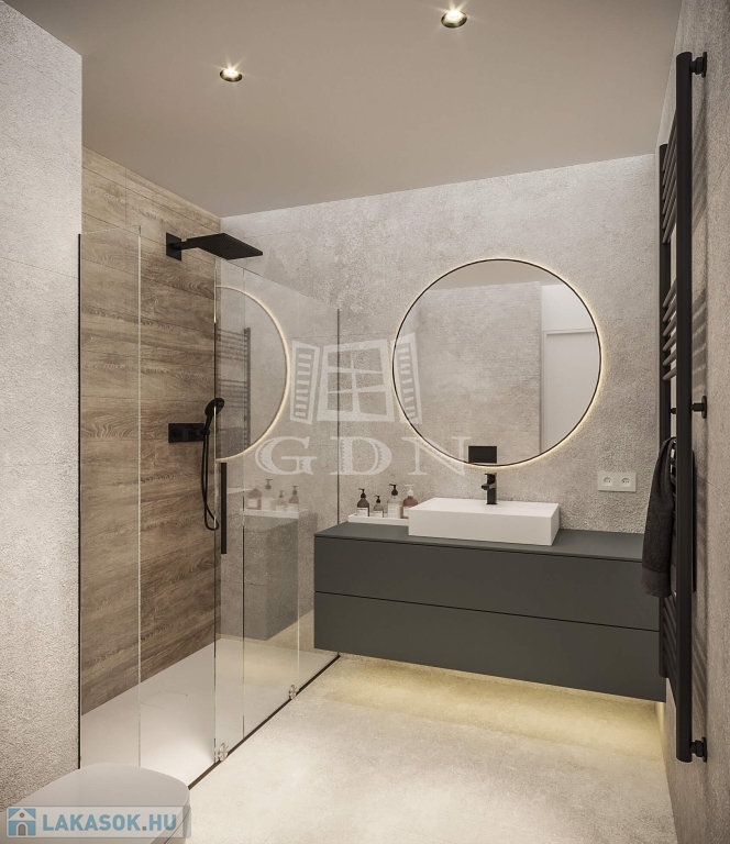 A lakás hőellátását és hűtését teljesen megújuló energiaforrással, a külső levegő hőenergiájának felhasználásával terveztük, amelyet osztott „Split” rendszerű hőszivattyúval hasznosítunk hűtési, fűtési és használati melegvíz termelés célra. A hőszivattyúk elektromos ellátása GEO tarifás áram vételezéssel történik. Ezenkívül a lakás magas színvonalú Smart Home rendszerrel van felszerelve.
