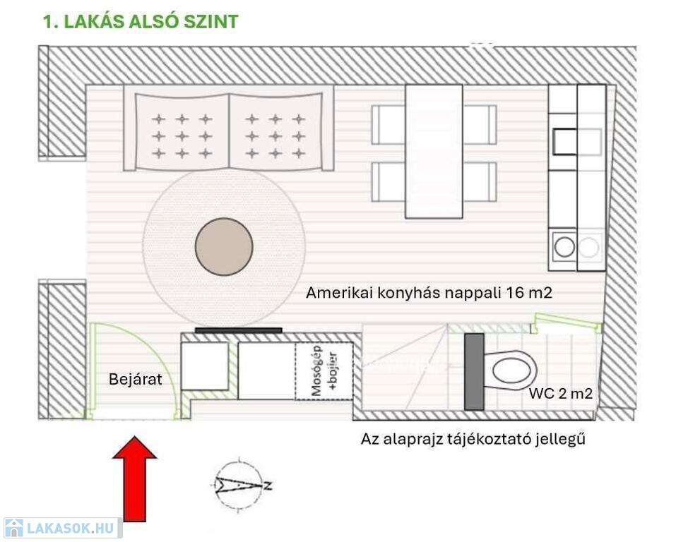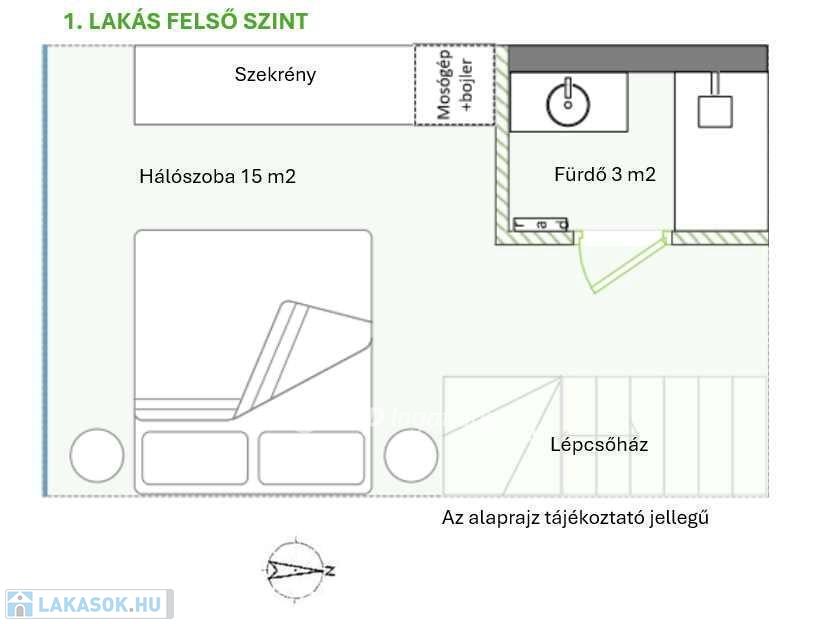 A földszinten amerikai konyhás nappali és WC az emeleten hálószoba valamint fürdőszoba található.