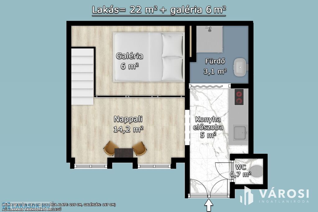 - Helyiségek: Előszoba-konyha, nappali, fürdőszoba, különálló WC