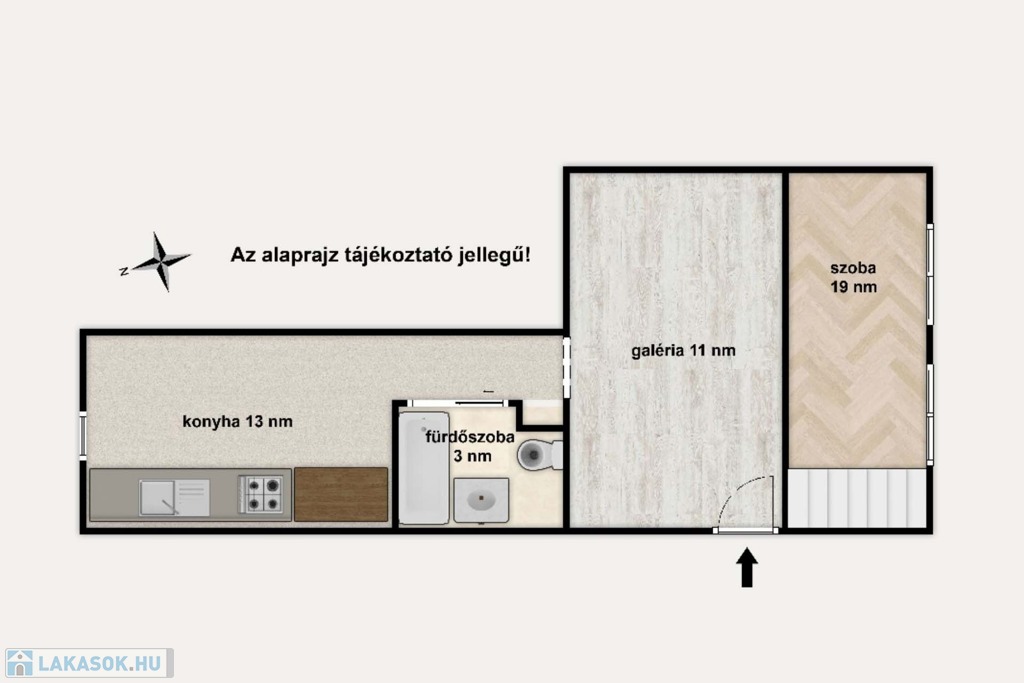 - A szobában klasszikus parkettaburkolat található, míg a konyhában vinyl padló.