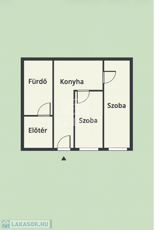 előszoba, hall, melyből két szoba nyílik, étkező, konyha, fürdőszoba