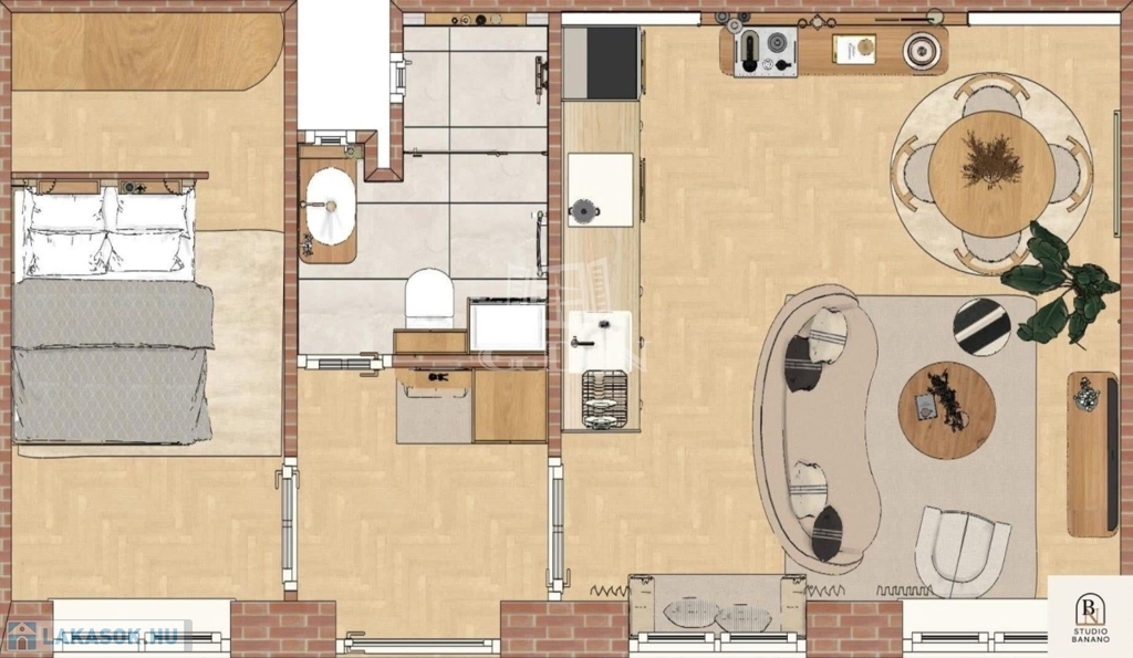 Nagy figyelmet kapott az enteriőr kialakítása. A kivitelező olyat alkotott, ahová mi is lelkesen költöznénk. Felkért egy lakberendezőt, hogy keltse életre a lakást - ezt a Studio Banano-nak köszönhetjük.