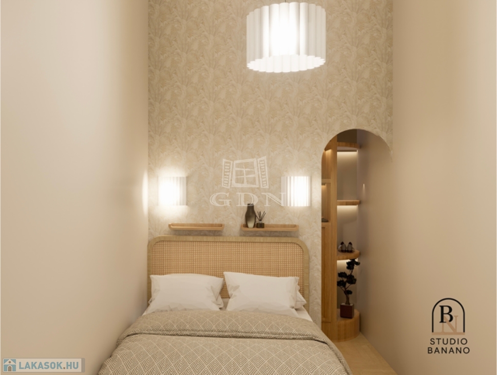 A 44m2-es lakás átalakítása során a beosztása fiatalos és tágas lett. A rendezett, kellemes társasház földszintjén található egy belső udvar. Innen belépve a lakásba, tágas előtérben találjuk magunkat, ahonnan balra a hálószóba nyílik, gardróbbal, szemben a fürdő és wc helyiség található, míg jobbra a tágas nappali vár minket.