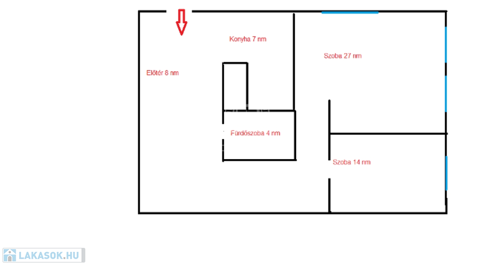 A 14 nm-es hálószobába az előszoba ajtóval szemből lépünk , a 27 nm-es nappali szobába egy kisebb közlekedő folyosó vezet.