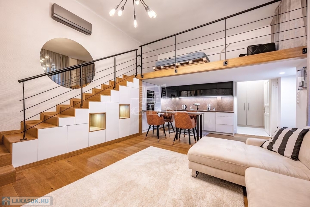 A 45 m² alapterületű + 18 m² galériás, első emeleti lakás liftes, rendezett társasházban található. Az udvari fekvés garantálja a nyugalmat és a csendet, miközben a belváros pezsgése csak egy lépésre van.