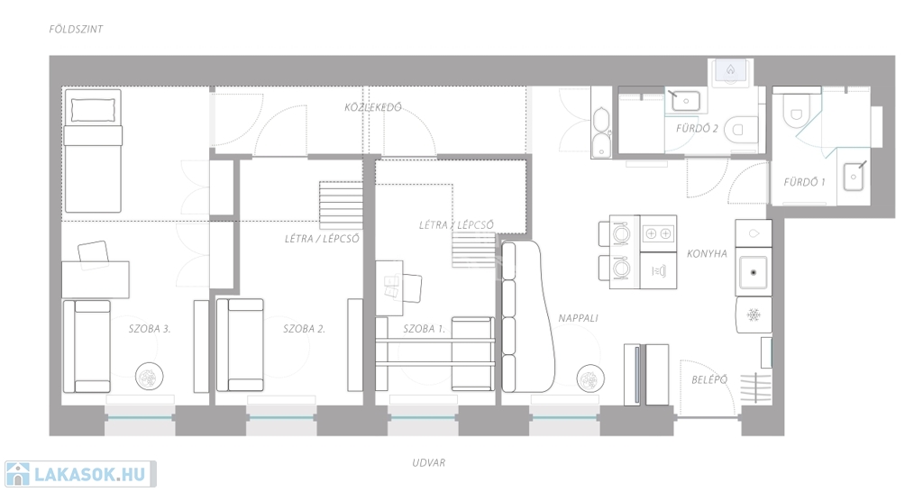 A lakás ablakai a csendes belső udvarra néznek, ahol biciklik tárolása is biztonságosan megoldható. Az ingatlan teljesen gépesített és berendezett: beépített sütő, indukciós főzőlap, mosogatógép, hűtő fagyasztóval, nagy TV több száz csatornával, üvegszálas nagy sebességű internet.