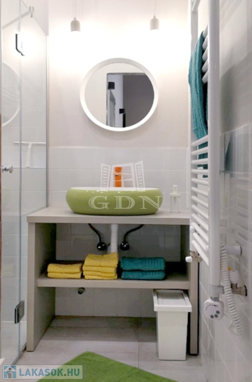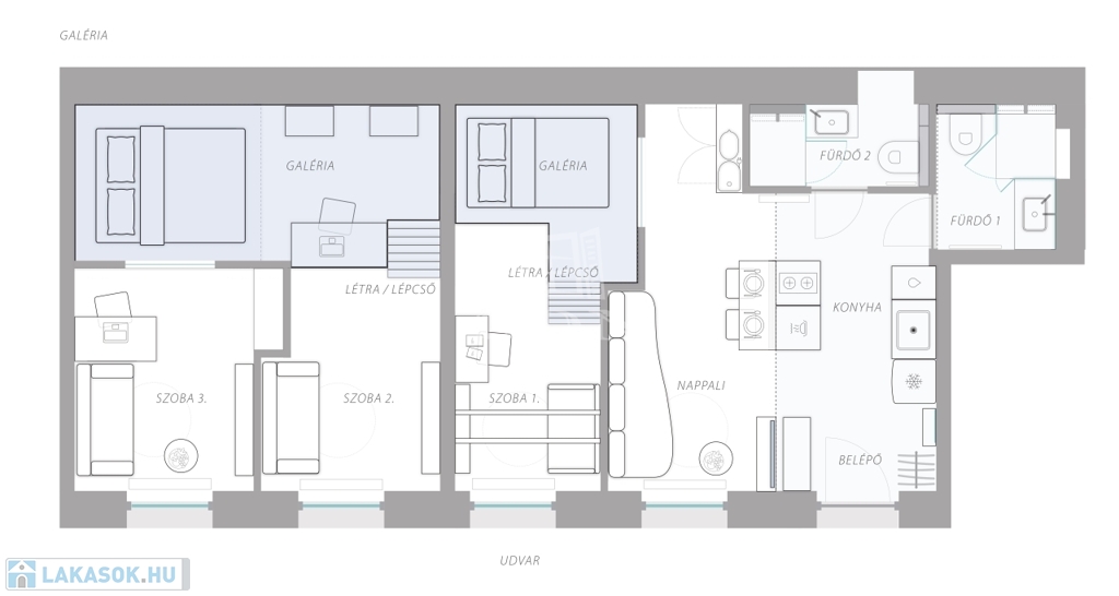 A 2017-ben teljeskörűen, lakberendező közreműködésével felújított, modern, 61 m²-es lakás amerikai konyhás nappalival rendelkezik, mellette három különnyíló, jól használható galériázott hálószoba található (11, 12 és 15 m²), továbbá két fürdőszoba (mindkettő WC-vel, mosdókagylóval és zuhanyzóval felszerelt, az egyikben mosó-szárítógép is van).
