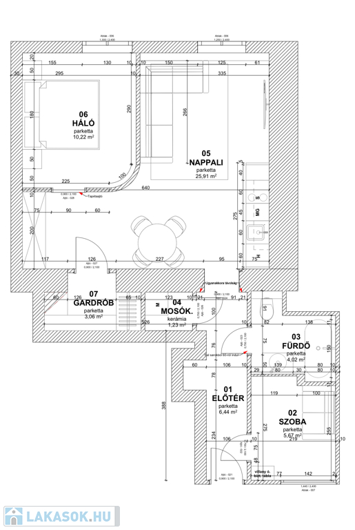 The apartment has a useful floor area of 60 square meters, on which 1 living room with an American kitchen and 2 bedrooms were created during the complete renovation. In addition, the property has a separate wardrobe room and a separate laundry room, where the washing machine and dryer outlets were created.