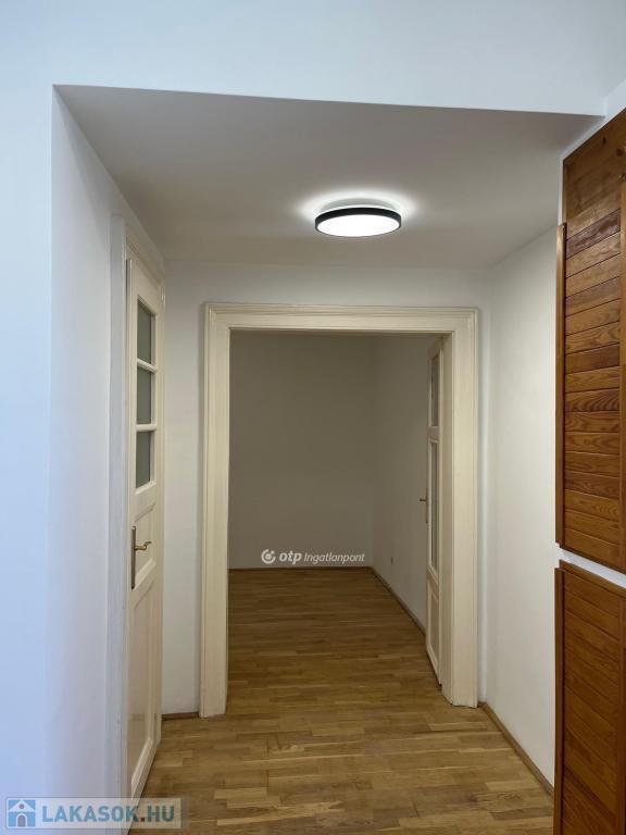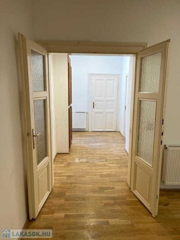 A lakás elosztása: a tágas előszobába lépve jobbra található egy dupla ajtó, ami a hall, nappali, konyha, étkező részbe vezet, ennek nagy ablakai az utcára néznek, ebből a nappaliból lett leválasztva egy hálószoba.