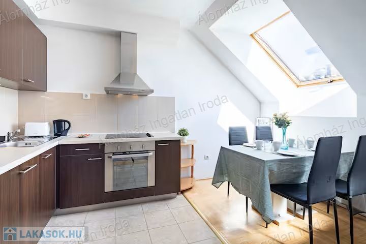 teljesen gépesített konyha (mosogatógép, sütő, főzőlap, elszívó, beépített hűtő és fagyasztó)