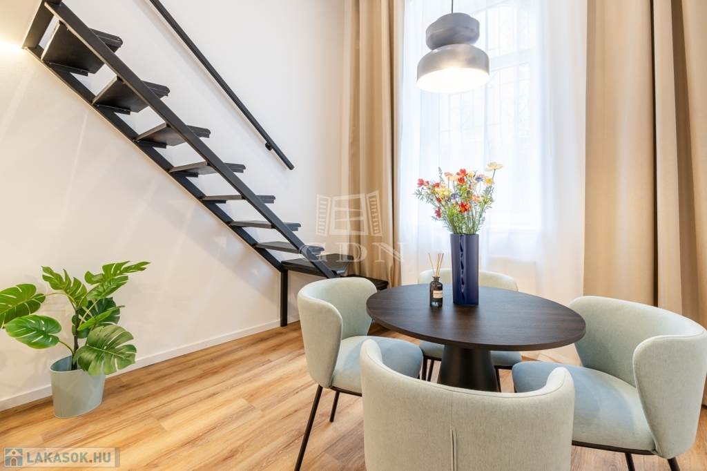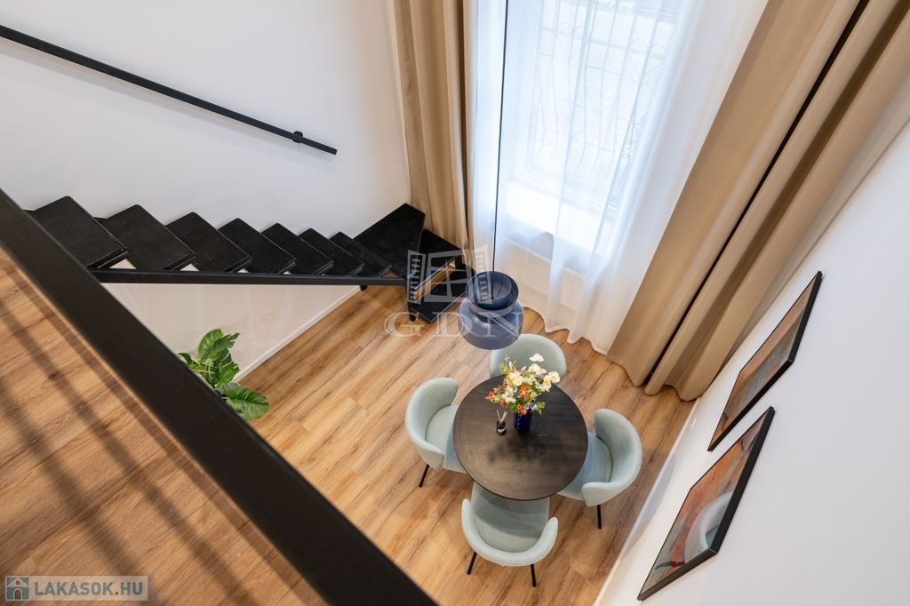 Eladásra kínálunk Budapest VII. kerületében, a Dob utca és Hársfa utca sarkánál, egy igényesen felújított, földszinti, kettéosztott ingatlant.