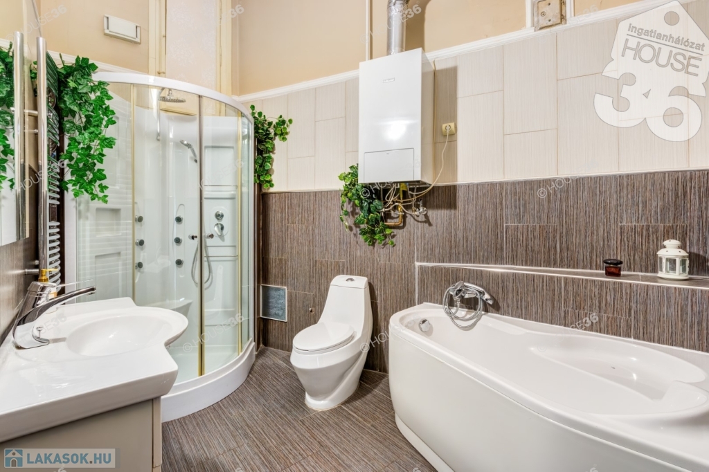 A ház lépcsőháza és homlokzata is gyönyörűen felújított, a lakásban modern fürdőszoba, sarokkád és nagyméretű zuhanyfülke.