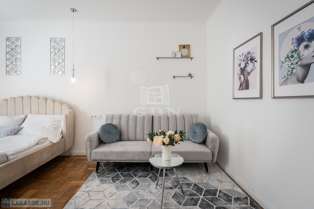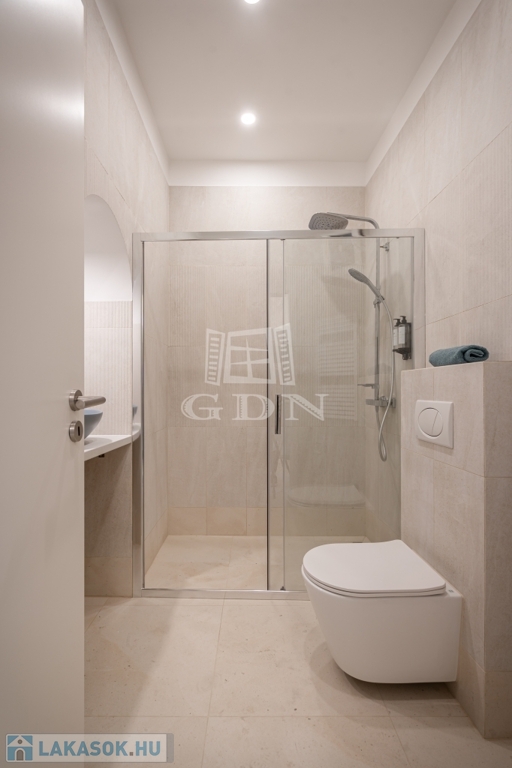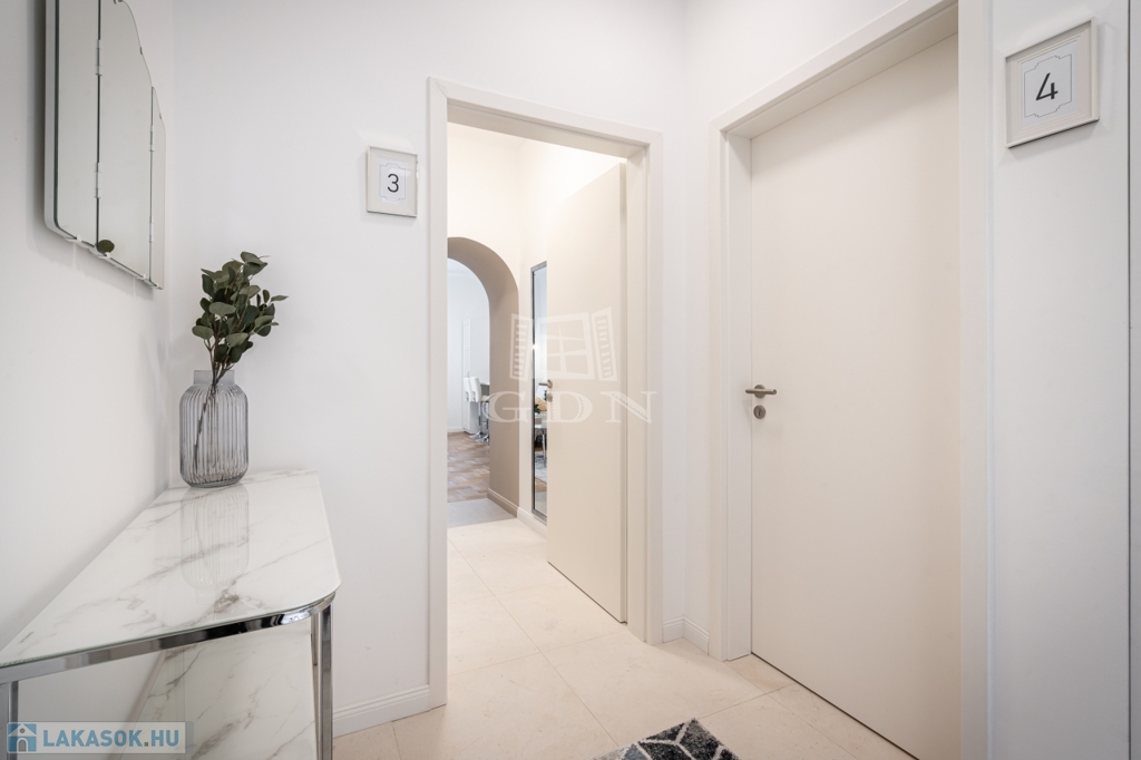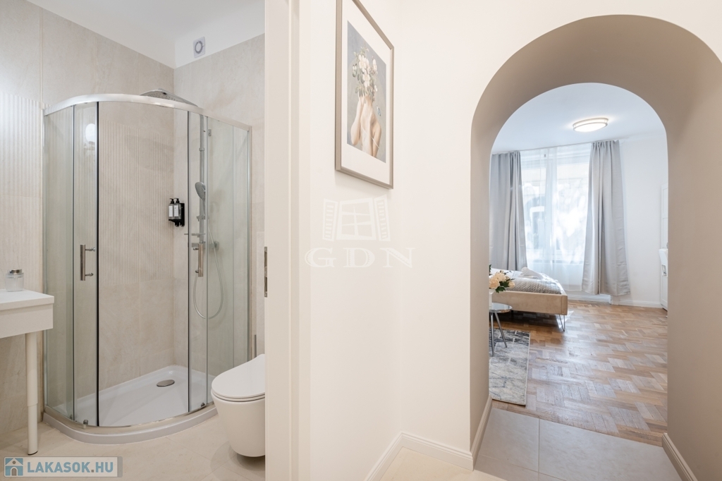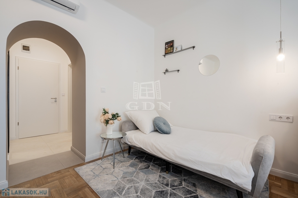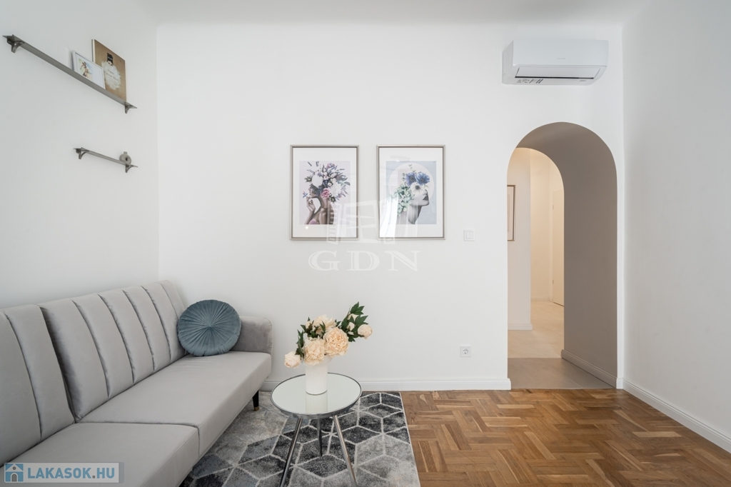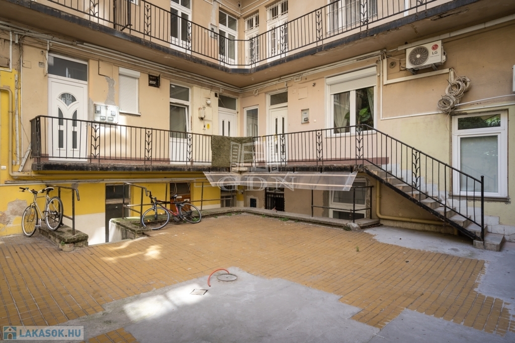 A nettó 64 m²-es lakás két különálló, önálló egységből áll, amelyek mindegyike saját fürdőszobával és konyharésszel rendelkezik. A felújítás néhány éve történt, a helyiségek klimatizáltak, a fűtést elektromos panelek biztosítják. Az ablakok a csendes belső udvarra néznek.