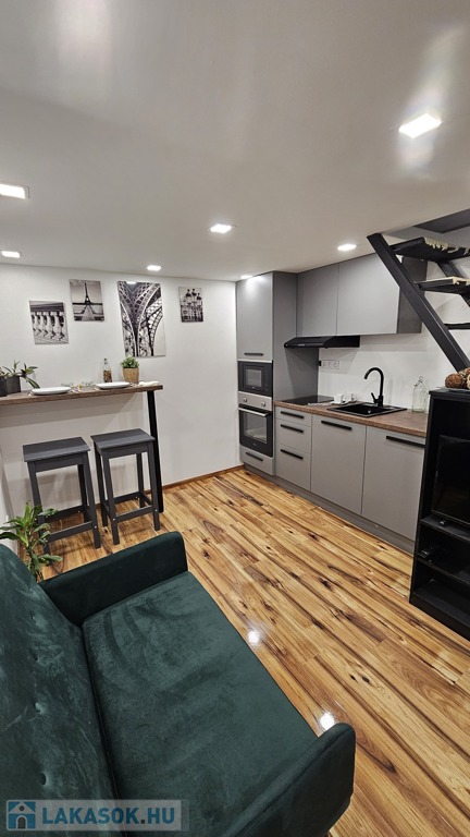 Amerika konyhás nappali, zuhanyzós fürdőszoba kerül kialakításra, a galéria pedig hálórésznek lesz kialakítva. A szoba ablak udvarra néző. A lakás külön bejárattal rendelkezik.