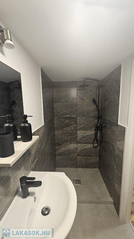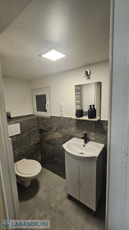 Fürdőszoba: épített zuhany,falsíkba épített toalett, villanybojler, törölközőszárító mosdó szekrénnyel tükör üvegpolccal.