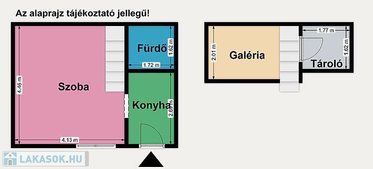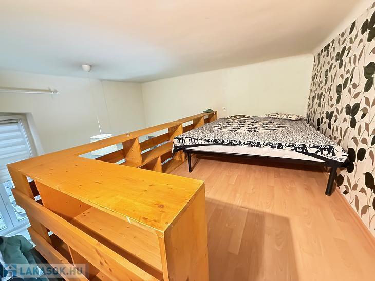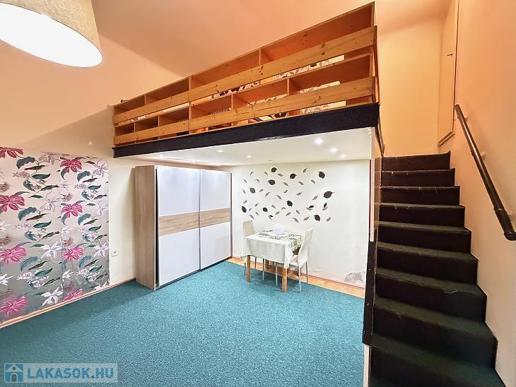 A földszinti ingatlan 1 szoba + konyhás kialakítású, galériával bővítve, amely kényelmes alvóteret biztosít, így a lakótér jól kihasználható. A galéria belmagassága 160 cm. A lakáshoz külön tároló is tartozik, ami tovább növeli a praktikumot.