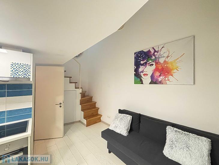 A belváros egyik legnépszerűbb részén kínálunk megvételre egy 20 nm-es, hangulatos és praktikus elrendezésű kislakást. Az ingatlan különlegessége a 15 nm-es, álló magasságú, zárható galéria, amely kényelmes, elkülönített hálórészként szolgál. Ennek köszönhetően az alsó szinten egy tágas, amerikai konyhás nappali került kialakításra, amely jól berendezhető és maximálisan kihasználható életteret biztosít.