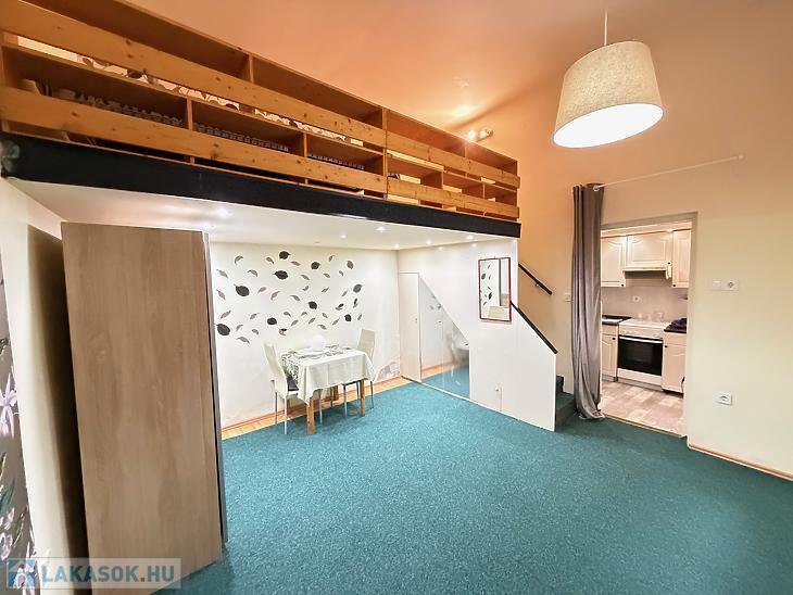 A földszinti ingatlan 1 szoba + konyhás kialakítású, galériával bővítve, amely kényelmes alvóteret biztosít, így a lakótér jól kihasználható. A galéria belmagassága körülbelül 170 cm. A lakáshoz külön tároló is tartozik, ami tovább növeli a praktikumot.