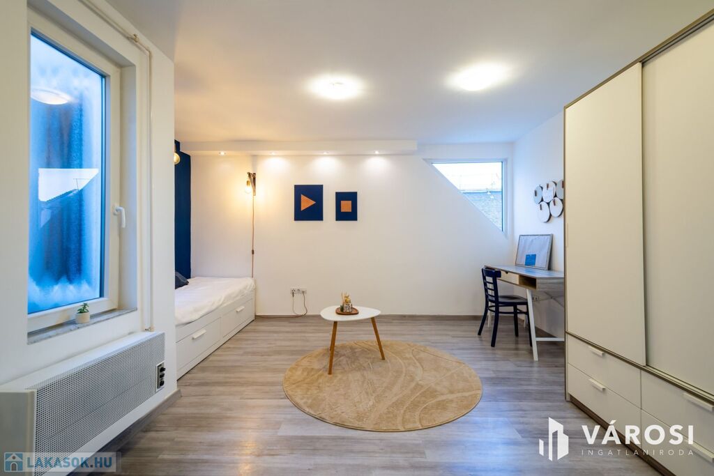 A sok ablaknak köszönhetően rendkívül világos a lakás, fiatalos berendezéssel, és egy garzonhoz képest kifejezetten tágas térrel rendelkezik.