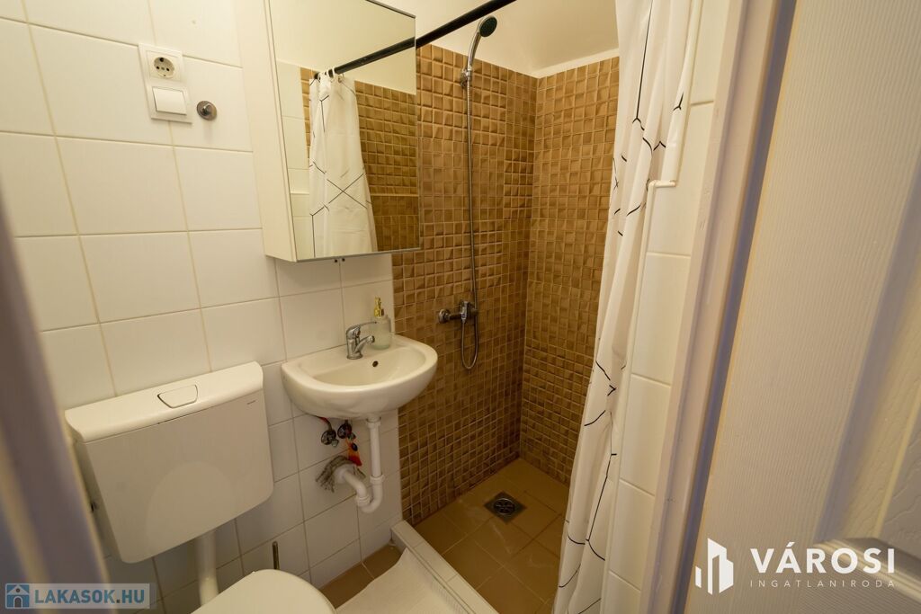Egy előszobából lépünk a nagyméretű szobába, ami a nappali - konyha -háló funkciót látja el, valamint egy zuhanyzós fürdőszobát találunk még itt.