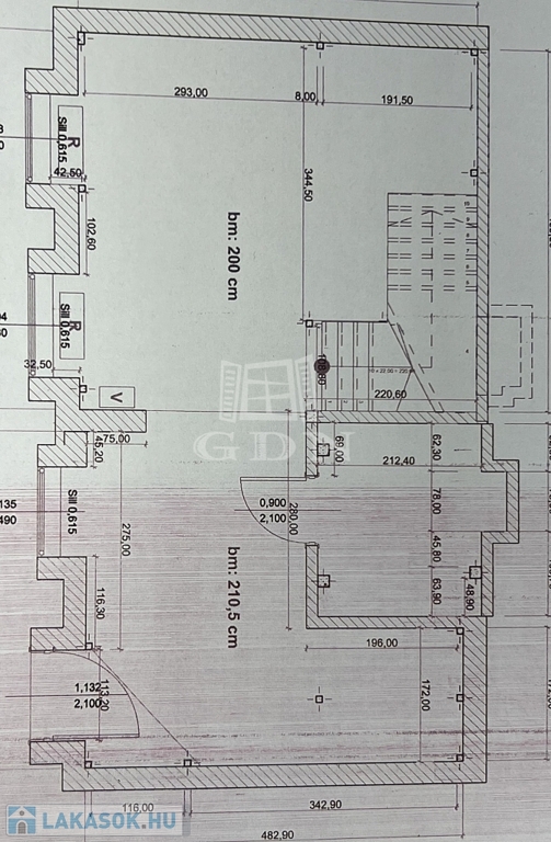 A tulajdoni lapon „műhely” megnevezésű, belmagasság a földszinten 210 cm, az emeleten 230 cm.