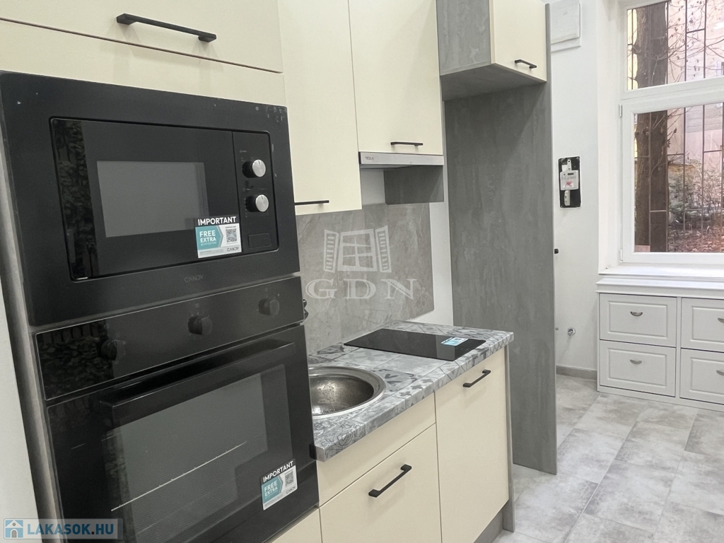Gépesített konyha: mosogatógép, sütő, mikró, főzőlap, kivezetett elszívó, hűtő