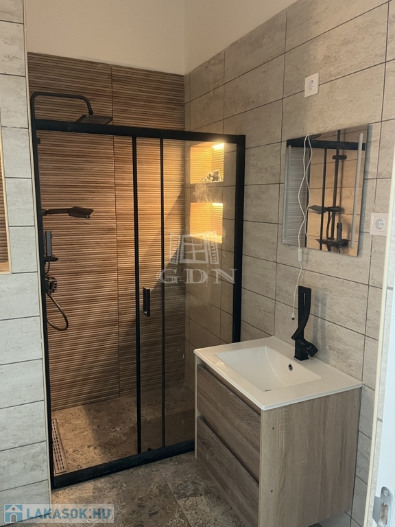Fürdőszoba: mosdószekrény, törülközőszárító, modern zuhanykabin elhúzható ajtóval