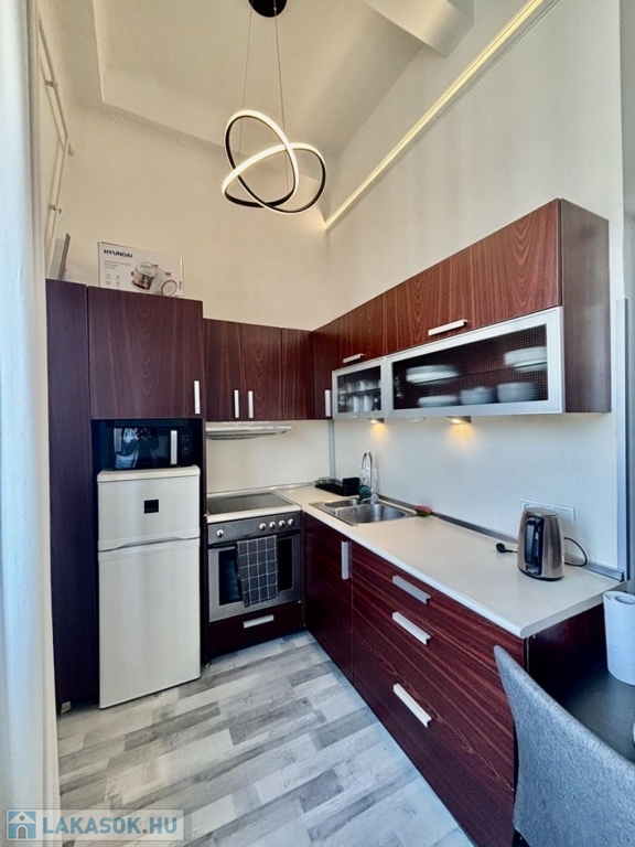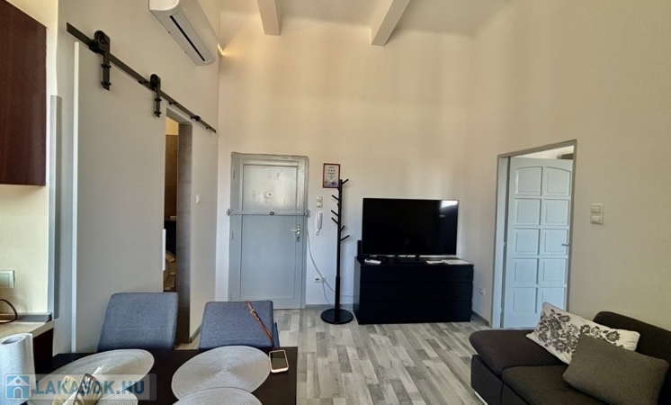 Az ingatlan egy jó állapotú, liftes ház legfelső emeletén helyezkedik el, 46 m2-es, amerikai konyhás nappaliból és egy tágas hálószobából áll. A lakás klímával felszerelt. Az ingatlan néhány évvel ezelőtt lett teljesen felújítva. A vételár a bútorokat és a berendezéseket is tartalmazza.