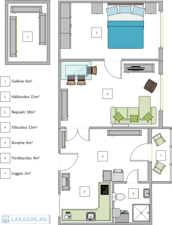 • valamint kialakításra került egy 6 m²-es álló galéria, amely praktikus plusz életteret biztosít.