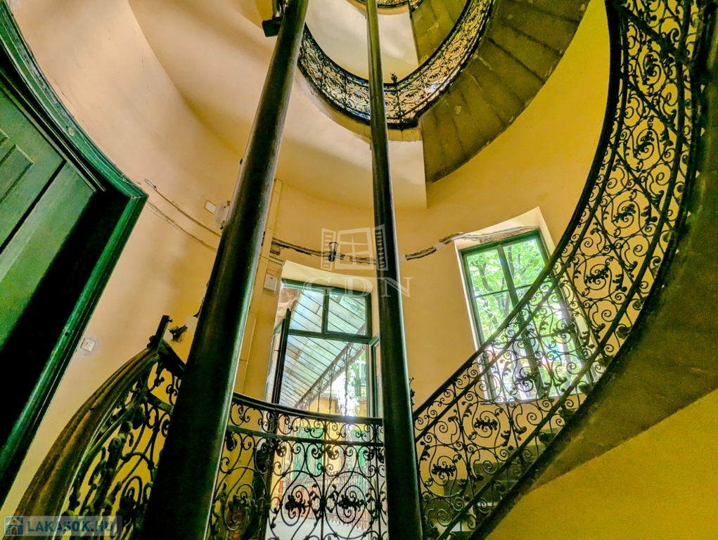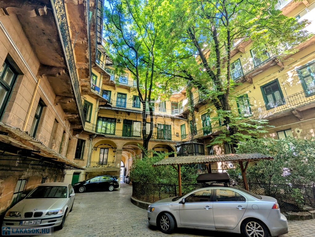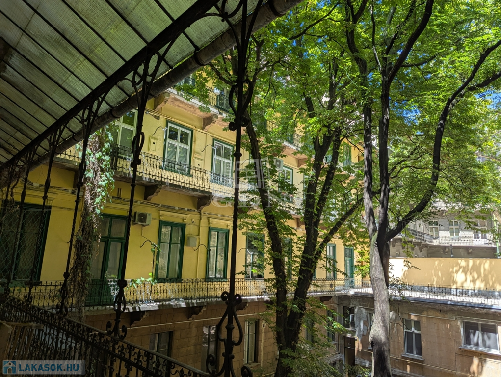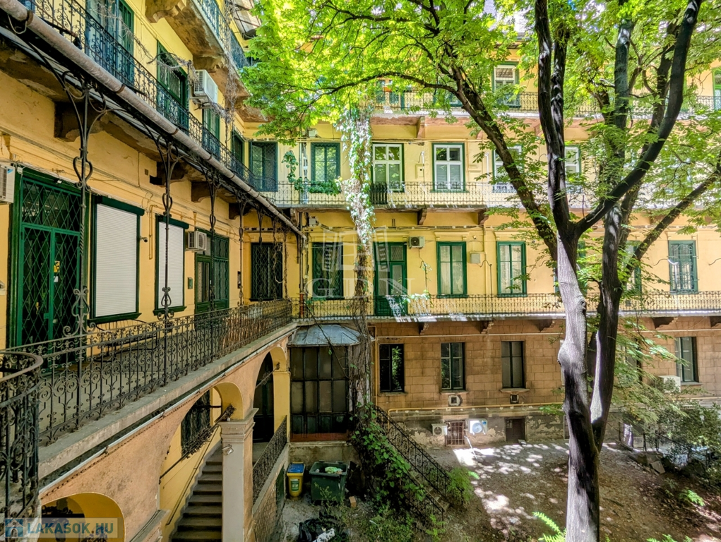 Az ingatlan egy 1880 körül épült, eklektikus-neoklasszicista társasház első emeletén található, vastag falakkal, hatalmas belmagassággal (4,6 méter!), és egyedi, köríves alaprajzi megoldással. A ház tágas, zöld belső udvara hangulatos, fákkal és bokrokkal övezett oázis a város szívében. A jelenlegi tulajdonosnak ritka lehetőségként saját kocsibeálló része is van az udvarban.