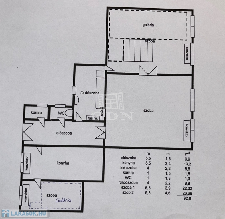 A lakás 2+1 szobás, külön konyhával, valamint nagy belmagassággal rendelkezik. Az otthon különlegessége a dupla galéria, amely kiválóan növeli a hasznos alapterületet, így ideális lehet akár dolgozósarok, hálórész vagy tároló kialakítására. A műanyag nyílászárók korszerűek, a fűtést gázkonvektorok biztosítják.